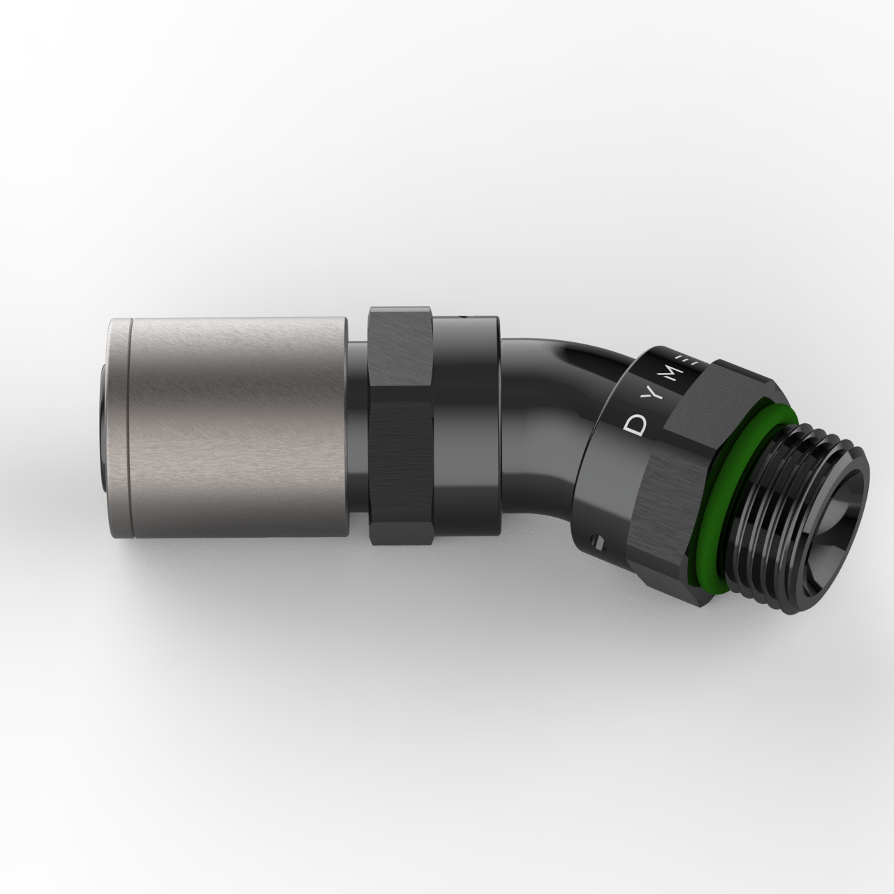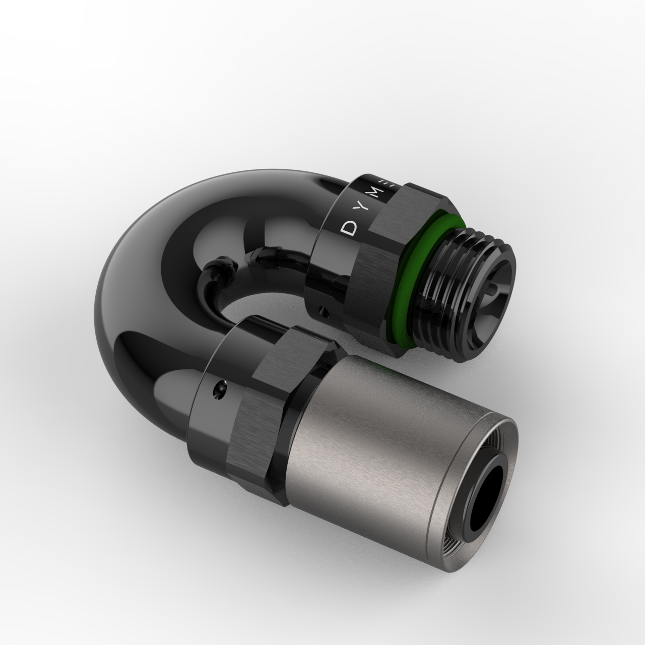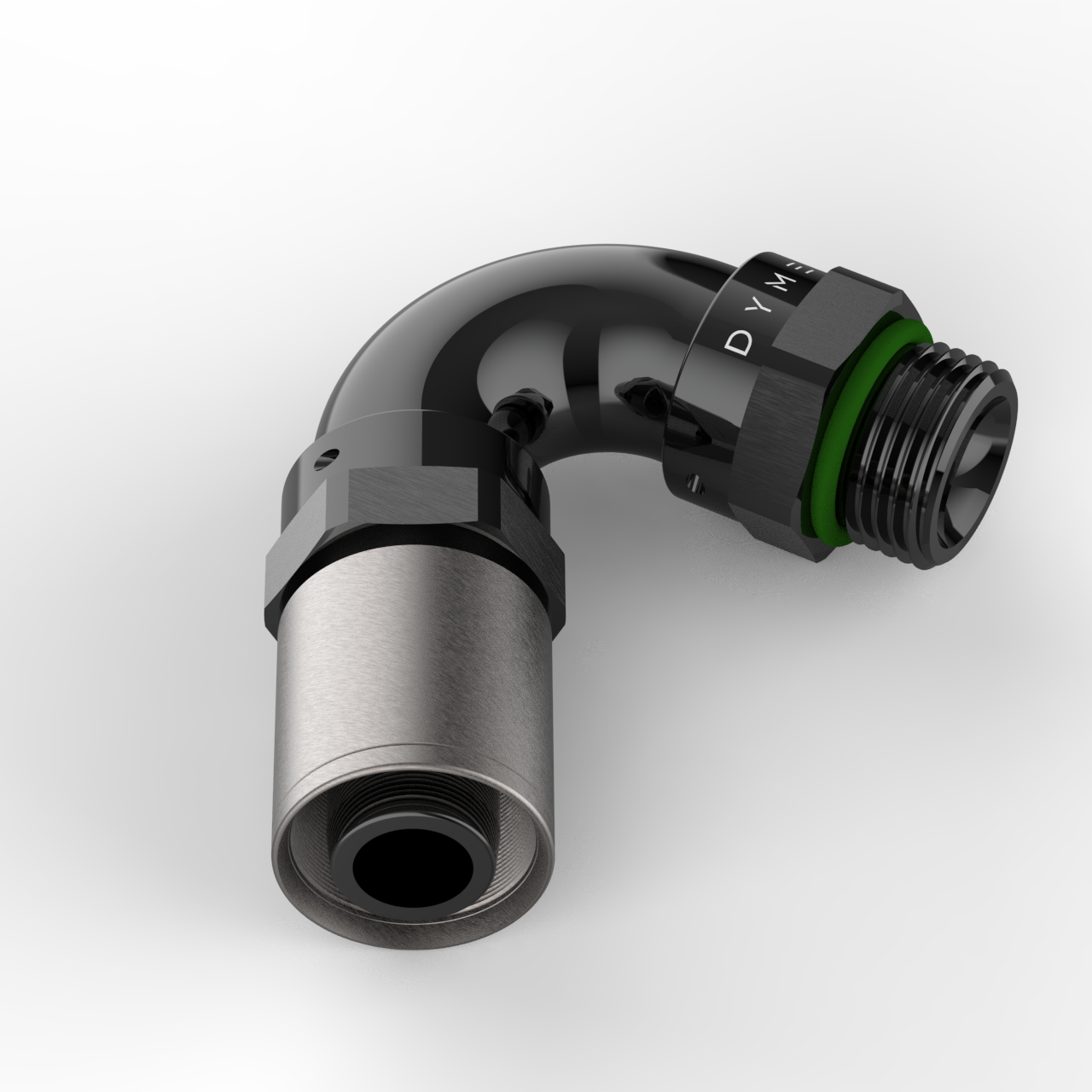 D-TYPE FATBOY ORB (SAE) CRIMP-ON 1-PIECE THICK TUBE, NO WELD FITTING, WITH DUAL SEAL FKM SWIVEL ANGLE ADJUSTMENT, COMPATIBLE WITH SUPERSTRASSE CPE (REUSABLE TYPE) RUBBER HOSE TYPES, ANGLES STRAIGHT THROUGH 180 DEGREE. 6061-T6 BILLET ALUMINUM, BLACK ANODIZED BODY.